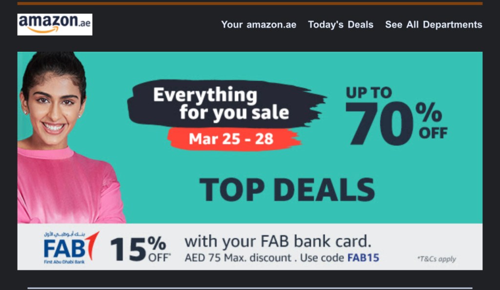 Pored besplatne dostave istog ili narednog dana, u zavisnosti od emirata iz kojeg se poručuje, za sve koji su registrovani kao Amazon Prajm članovi, korisnici koji svoju onlajn kupovinu obavljaju karticama banke First Abu Dhabi, imaju prava da prilikom kupovine ostvare i dodatnih 15 odsto popusta (ali najviše do 75 dirhama) na odabrane proizvode.